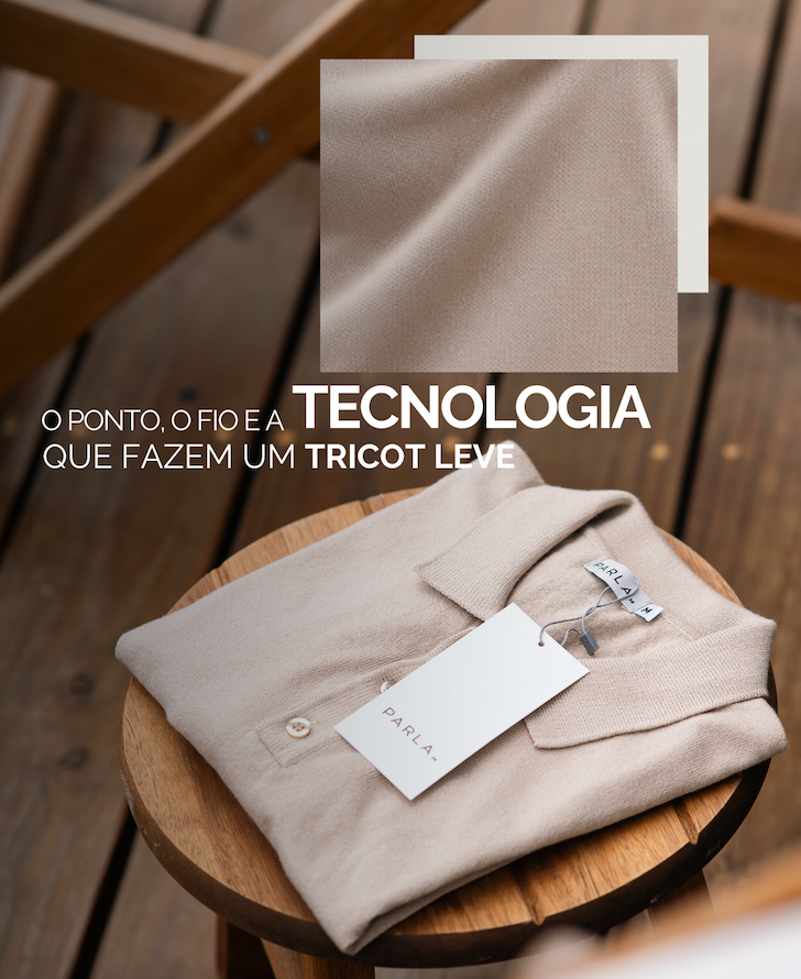 E o mais curioso é que nada disso aparece sozinho. No corpo, o tricô leve se comporta como quem entende o contexto: refresca no sol, segue respirando mesmo no abafado da cidade, e cria esse visual elegante sem esforço que a Parla busca em todas as peças. É um tricô que funciona sozinho, com uma bermuda mais arrumada, com chino ou até como camada sobre uma camiseta fina. Ele se adapta, mas sempre devolve a mesma sensação: a de que existe muito mais técnica por trás do que o olho percebe.